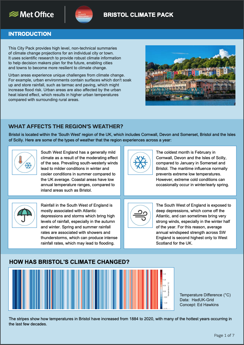City Packs were developed for dozens of urban areas, consisting of facts sheets to raise awareness of how the local climate may change until 2100. Heat Packs followed on from City Packs to improve users’ understanding of how heat hazards might impact their cities, and which parts are at greatest risk from extreme heat. They also help users with emergency planning and building longer term resilience to heat events. Flood Profiles provide information for communities about past flooding events and how their occurrence may change in the future and Storymaps have been developed to communicate climate information in novel ways.